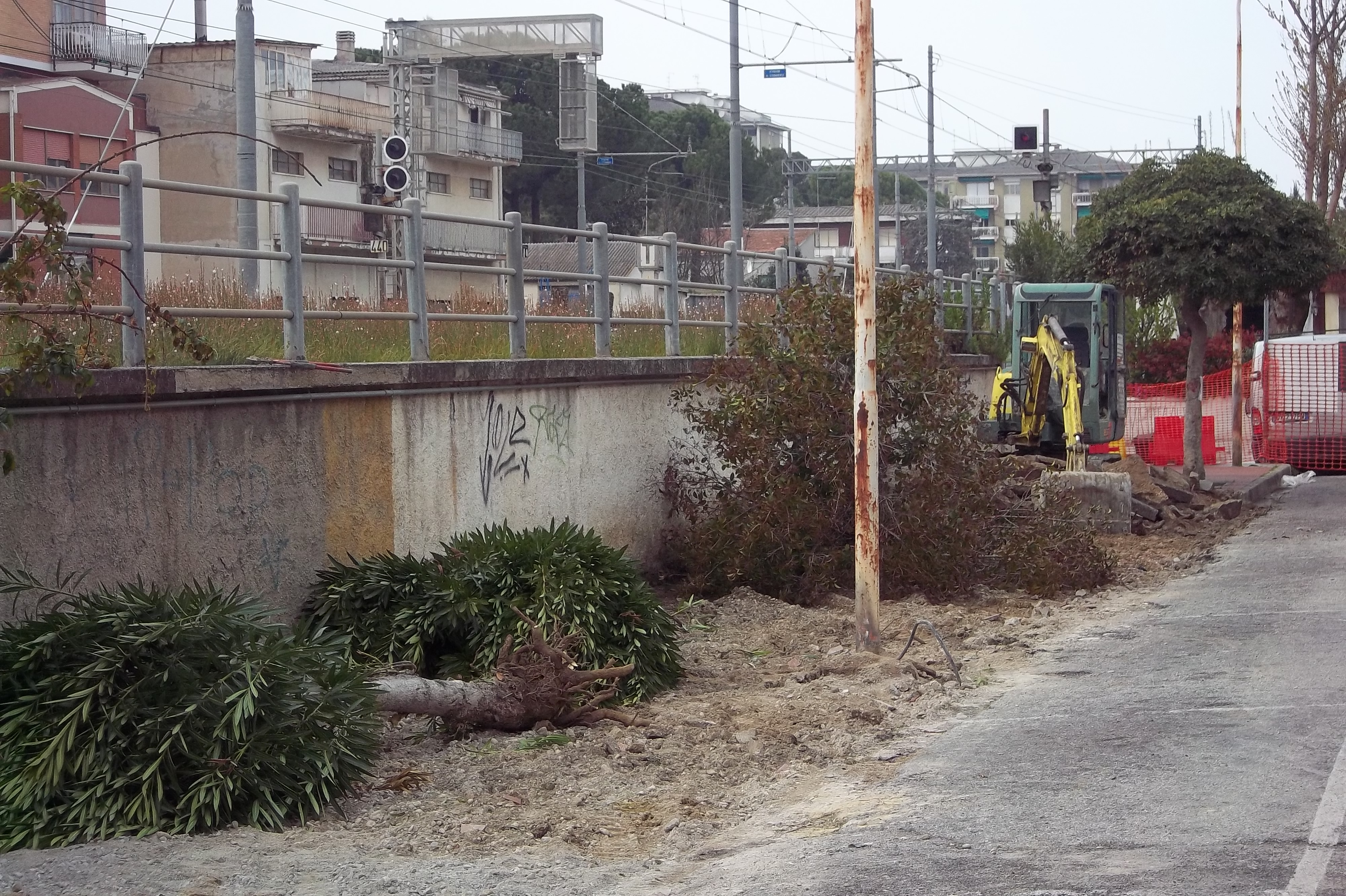 Dopo l’abbattimento dei maestosi pini del Parco Bixio, sono iniziate la demolizione del marciapiede e la mattanza degli alberi di via Colombo.
