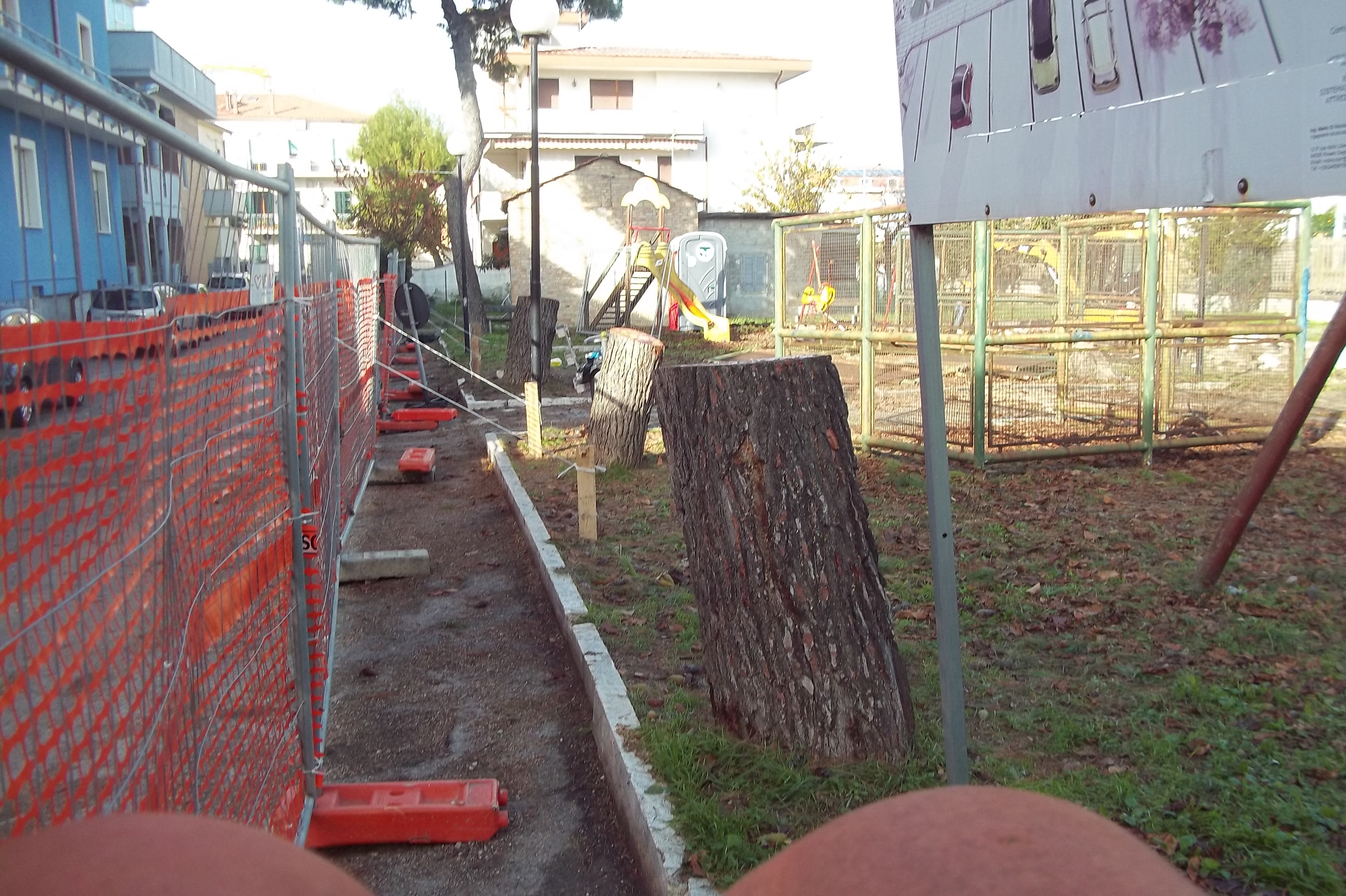 2) la crescita incontrollata di piante ad alto fusto e le rilevanti sconnessioni, sia del marciapiede che verrà demolito, e sia della sede viaria;